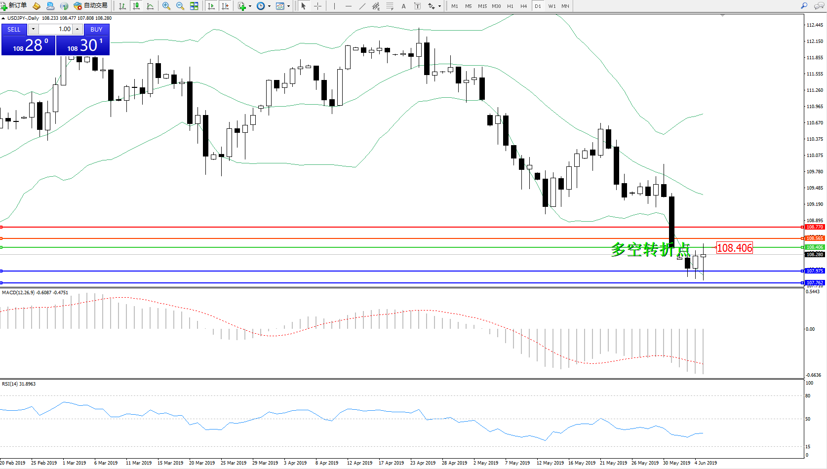 交易策略:108.406下方看跌,目标107.975107.762
