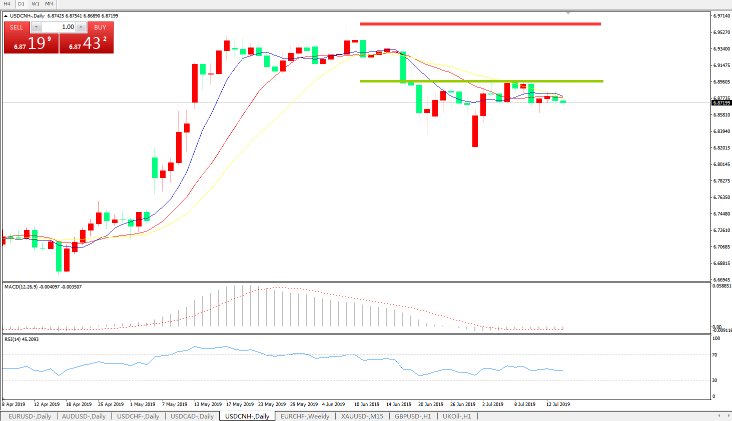 技术面简析:日图均线有发散下行迹象,MACD徘徊在0轴附近且动能柱若隐若现,RSI逐步走低,预计短期汇价将继续整理或向下修正,中期关注6.90附近多空转折区域压制是否有效及中美贸易谈判最新进展。