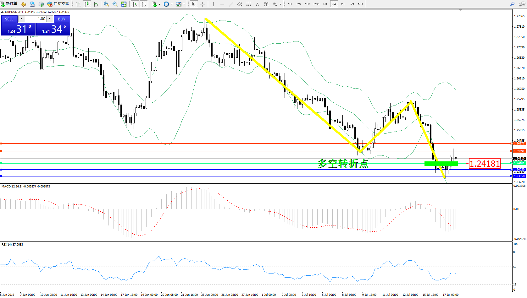 交易策略:1.24181上方看涨,目标1.24491、1.24677