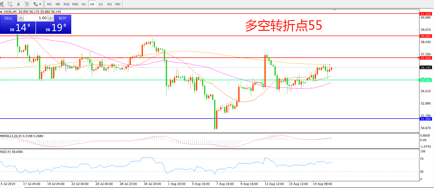 4小时图看,油价呈现震荡走高,55美元形成下方支撑,200周期均线形成阻力,MACD红柱增加, RSI指标走平,日内震荡上行概率较大。