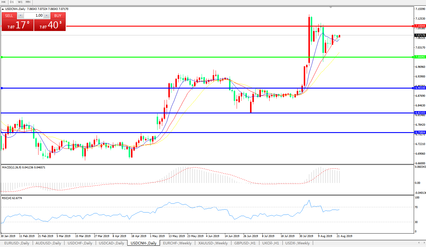 技术面简析:日图均线整体呈攻势,汇价延续高位整理态势偏强势,MACD运行在0轴上方且动能有衰弱迹象,RSI逐步走缓下行,预计汇价将维持高位整理,不排除进一步上行可能,但空间有限;但需警惕中美贸易谈判及近期的杰克逊霍尔会议最新结果,反复无常的最新进展正不断刺激市场的神经。
