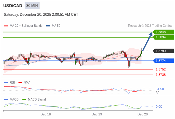 美元/加元 当日内 : 看涨,当 1.3774 为支撑位。
