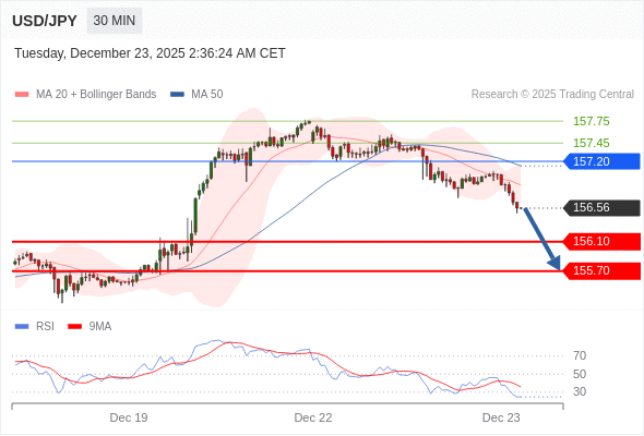 交易策略: 在 157.20 之下,看跌,目标价位为 156.10 ,然后为 155.70 。