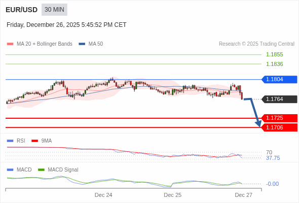 欧元/美元 当日内 : 看跌,在 1.1804 之下。