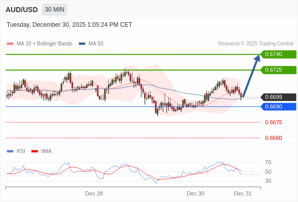 在 0.6690 之上,看涨,目标价位为 0.6725 ,然后为 0.6740 。
