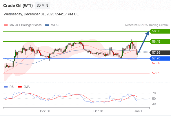 在 57.70 之上,看涨,目标价位为 58.45 ,然后为 58.90 。