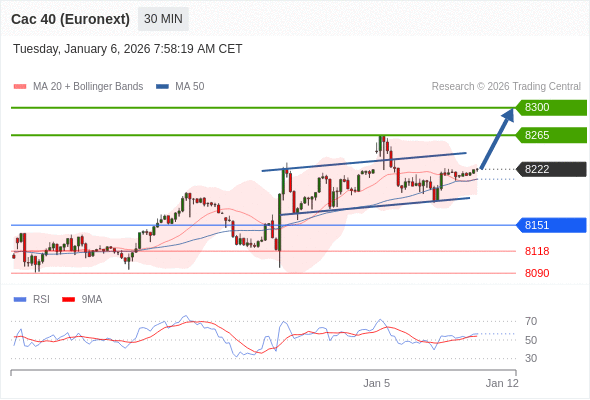 法国CAC指数期货 (Euronext) (F6) 当日内: 在8151之上,看涨。