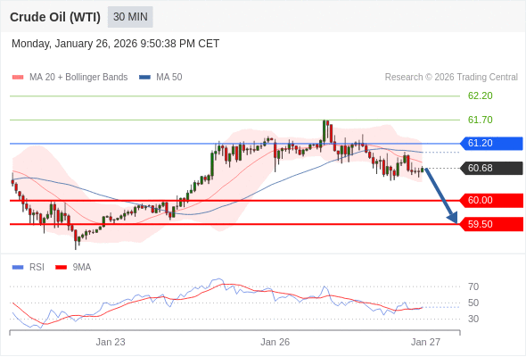 交易策略: 在 61.20 之下,看跌,目标价位为 60.00 ,然后为 59.50 。