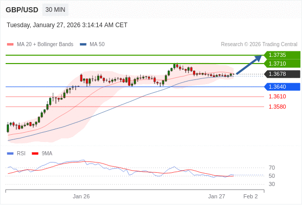 在 1.3640 之上,看涨,目标价位为 1.3710 ,然后为 1.3735 。