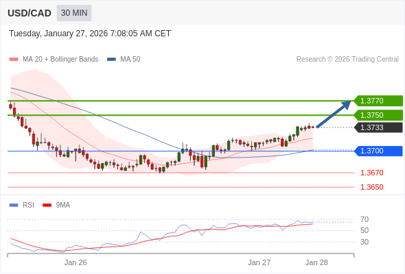 在 1.3700 之上,看涨,目标价位为 1.3750 ,然后为 1.3770 。
