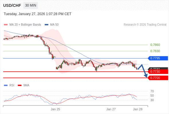 交易策略: 在 0.7795 之下,看跌,目标价位为 0.7730 ,然后为 0.7700 。