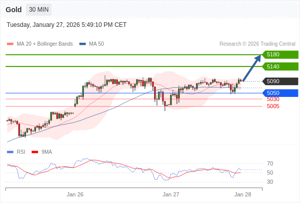 在 5050 之上,看涨,目标价位为 5140 ,然后为 5180 。