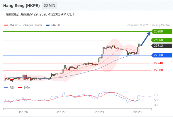在 27500 之上,看涨,目标价位为 28000 ,然后为 28280 。
