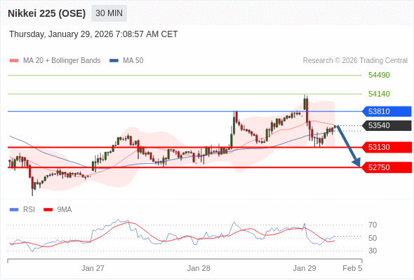 在 53810 之下,看跌,目标价位为 53130 ,然后为 52750 。