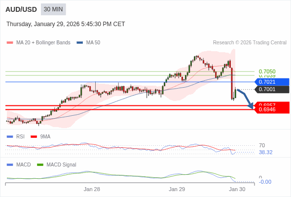 澳元/美元 当日内 : 看跌,在 0.7021 之下。