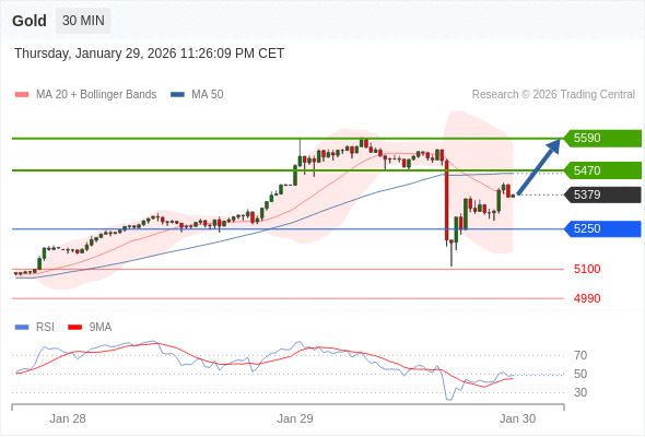 交易策略: 在 5250 之上,看涨,目标价位为 5470 ,然后为 5590 。