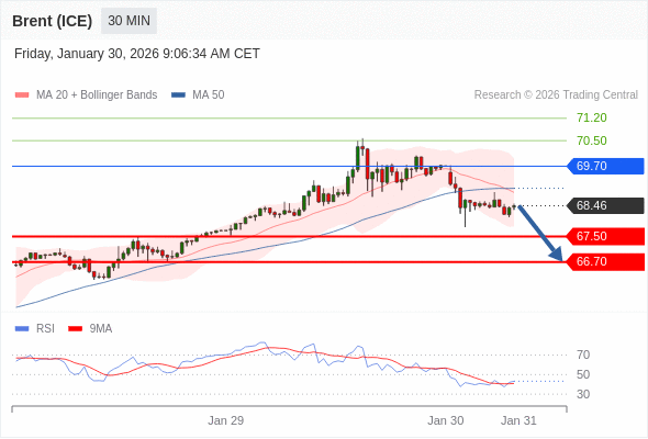 交易策略: 在 69.70 之下,看跌,目标价位为 67.50 ,然后为 66.70 。