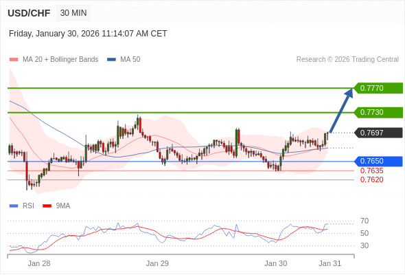 在 0.7650 之上,看涨,目标价位为 0.7730 ,然后为 0.7770 。