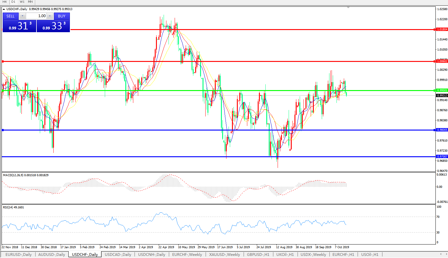 交易策略:0.9950下方看跌,目标0.9800、0.9700