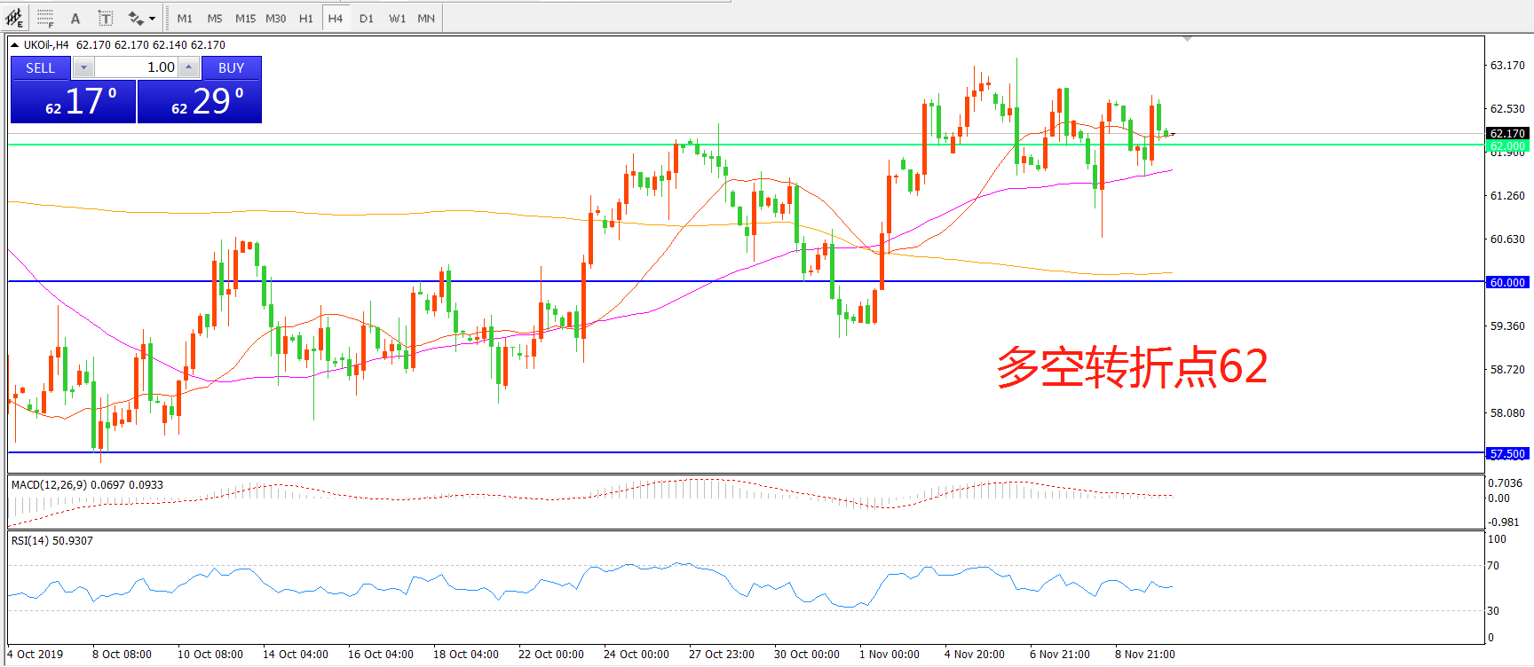 4小时图看,油价延续高位震荡走势,62美金成为短期价格支撑,均线系统走平,MACD红柱减少,RSI指标走平,震荡上行概率较大。