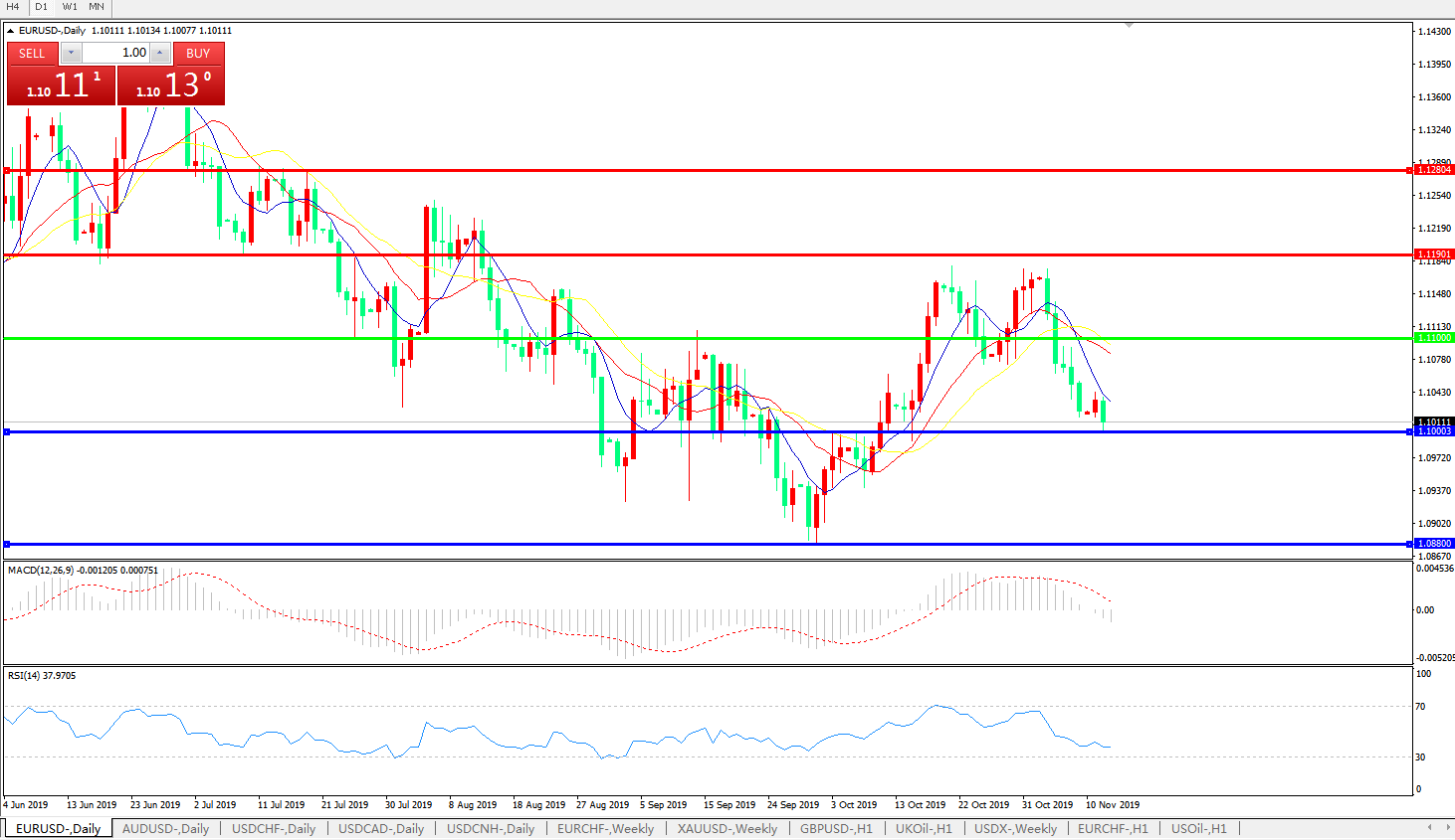 欧元兑美元在周二欧洲时段延续跌势,最低触及1.1015,为10月15日以来整四周新低。上周以来欧元兑美元的下行趋势仍在延续,虽然日内经济数据表现向好,但却于事无补; 德国11月ZEW经济信心指数由10月的-22.8回升至-2.1,远好于预期的-13.0,但投资者经解读后认为,与其说当月的数据向好,不如说是上月的数据,及受其悲观影响之后的预期值过低,而数据本身仍处于负区间典故状况很难说是真正靓丽;在此状况下,欧元汇价仍受负面情绪打压。投资者继续押注欧洲央行之后会有进一步的宽松政策预期,相反,在全球贸易局势趋向乐观的背景下,相比欧元区前景,投资者更加看好美国经济未来表现,大西洋两岸的经济基本面落差因而继续左右着市场情绪。 眼下,欧元汇价也再度来到了1.10心理关口,一旦失守,下方将打开跌至1.0920的下行空间。