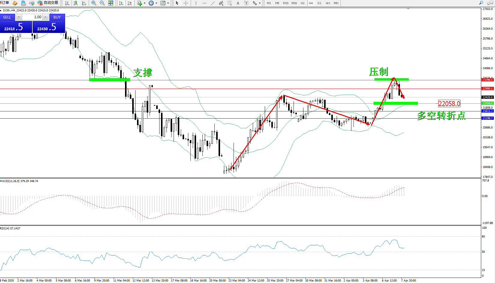 技术点评:多头动力延续布林带指标上轨附近持续上扬中,触及前期低位附近支撑转压制后遇阻回撤,布林带指标呈收口走势中,关注中轨附近节点,MACD指标处于多头区域高位回撤平移中,RSI指标处于多头区域高位回撤后开始平移;