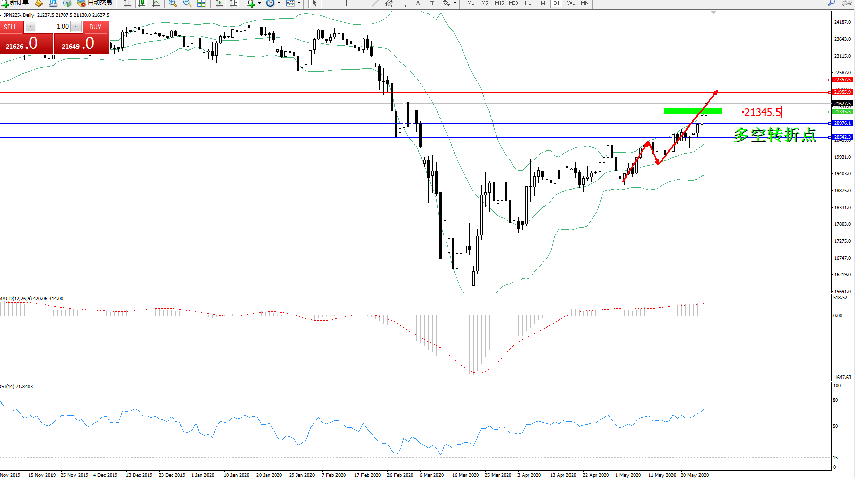 日经225指数527日(周三)收盘上涨168.83点,涨幅0.79%,报21440.00点。市场对国际关系趋于紧张感到担忧,日本将编制一份规模1.1万亿美元的新刺激计划,其中将包括相当大规模的直接支出,以缓和新冠疫情对经济的打击;这项刺激计划的部分资金将由政府的第二份追加预算提供,它是上个月政府推出的1.1万亿美元刺激方案之外的一份新计划,至此日本政府的抗疫支出总规模达到234万亿日元,约相当于日本国内生产总值(GDP)40%;日本首相安表示,面对未来的艰难道路,必须采取一切办法来保护企业和就业。还必须采取一切必要措施,为新一轮疫情做好准备。