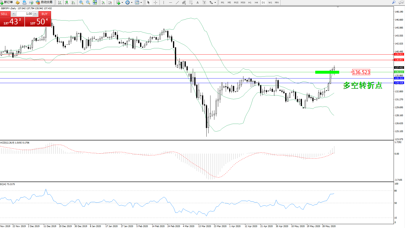 交易策略:136.523上方看涨,目标138.851、139.922