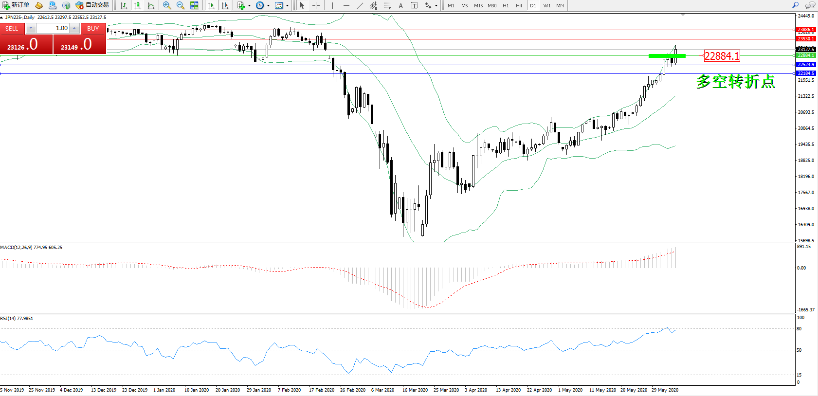日经225指数65日(周五)收盘上涨164.26点,涨幅0.72%,报22860.00点。日本4月家庭支出以创纪录的速度下滑,新冠疫情导致人们无法旅行或外出就餐,而未来就业岗位流失可能增加,也打击了消费者信心。黯淡的数据将使决策者承受压力,要防止经济出现更大幅度的下滑。预期这个季度经济将进一步滑入衰退。周五公布的政府数据显示,4月家庭支出较上年同期下滑11.1%,为2001年有可比数据以来的最快下滑速度。3月降幅为6.0%。不过预估中值的降幅更大,为15.4%。预期消费在4月或5月已经触底反弹,因为上月解除了全国封锁措施之后,企业陆续恢复营业。不过他们说,由于企业和家庭对于支出仍很谨慎,复苏将会缓慢而脆弱;消息人士称,日本央行的预测反映了日本经济可能在4月或5月触底的观点,这加大了日本央行在6月利率评估时放弃大胆宽松措施的可能性,日本央行本月可能维持其认为日本经济将在今年下半年逐步复苏的观点。
