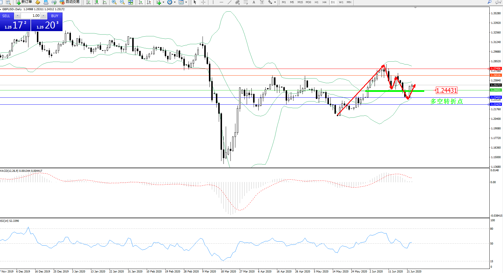交易策略:1.24431上方看涨,目标1.26516、1.27456