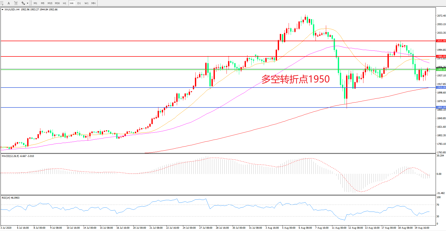 交易策略: 在1950.00之下看跌,目标1910.00 1865.00