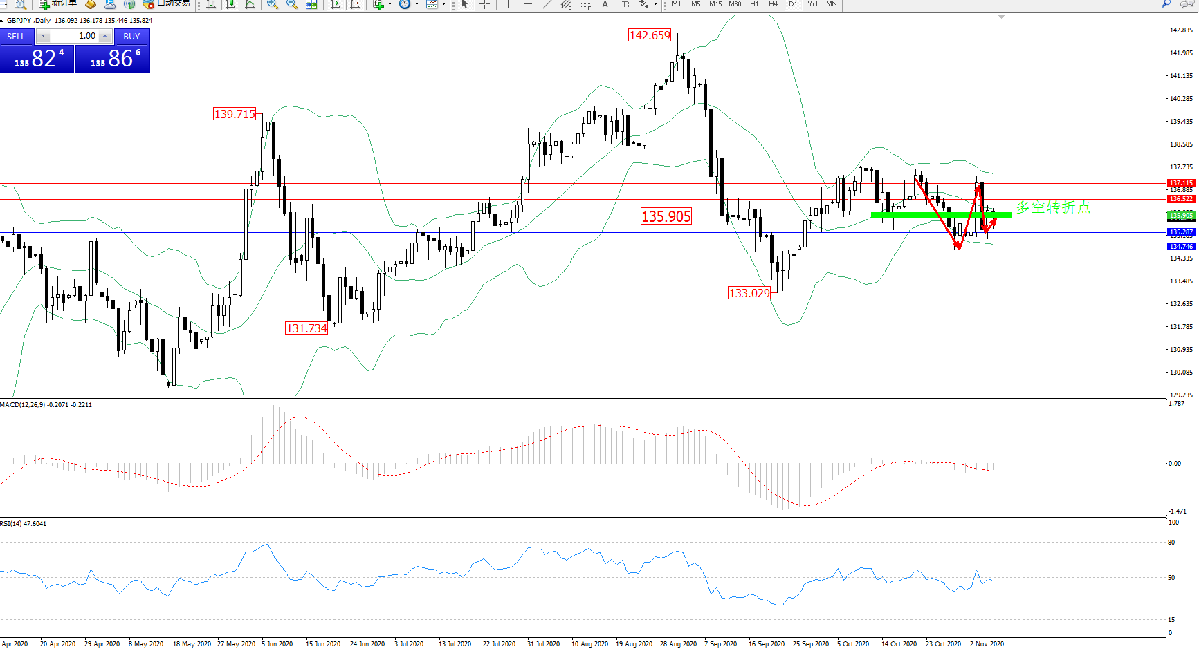英镑兑日圆处于135.824附近整理,英欧谈判仍未解决重大分歧,这令投资者担忧谈判前景,英国央行此前表示,如果英欧贸易谈判未能达成协议,此外,英国经济也因全面封锁而受创,第四季度经济复苏态势将明显放缓。近期风险偏好情绪向好提振风险货币主导整个市场,但也有可能是利好提前释放,透支了后面的行情。因英国自身经济不佳,未来有可能出现负利率,结合目前整体走势仍是勉力抬升,市场仍在对英国央行扩大QE的政策决定进行咀嚼,并且也重新关注其英国疫情下的封锁措施,以及英国脱欧谈判的大方向。