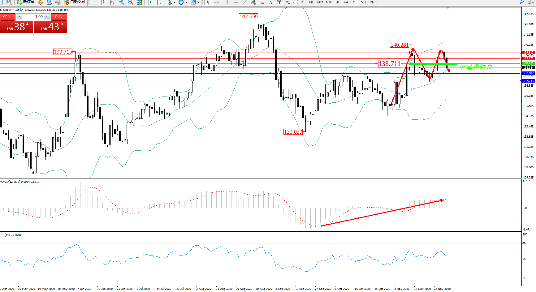 备选策略:138.711上方看涨,目标139.122、139.612
