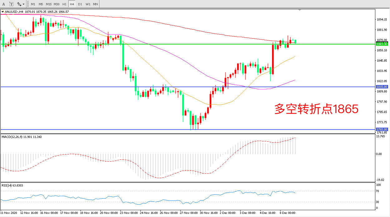 周二(12月8日),美国财长姆努钦称,他和佩洛西交谈过,他交给佩洛西一份9160亿美元规模的救助方案,这是特朗普政府大选以来首次试图打破新刺激谈判僵局的动向。市场对财政刺激推出信心增强,现货黄金延续近期强势表现,收报1868.26美元/盎司。