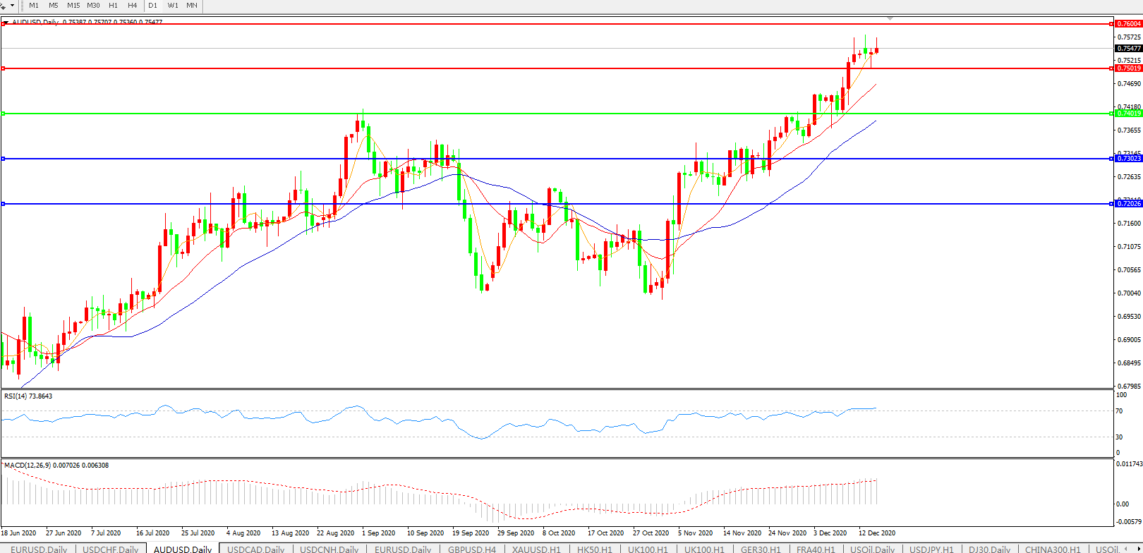 交易策略:0.7400上方看涨,目标0.7500、0.7600