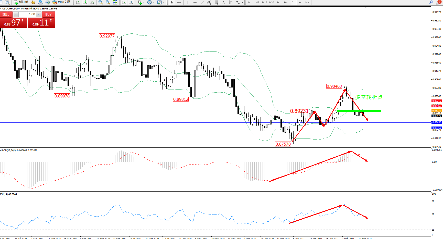 交易策略:0.89231下方看跌,目标0.88650、0.88359