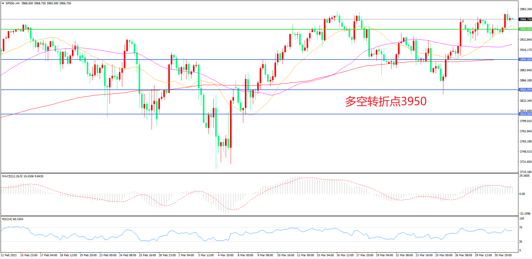4小时图看,标普500延续高位震荡,低点逐渐抬高,短期走势表现较强,21周期均线成为短期支撑,MACD红柱缩短,RSI指标走平,日内震荡上行概率较大。