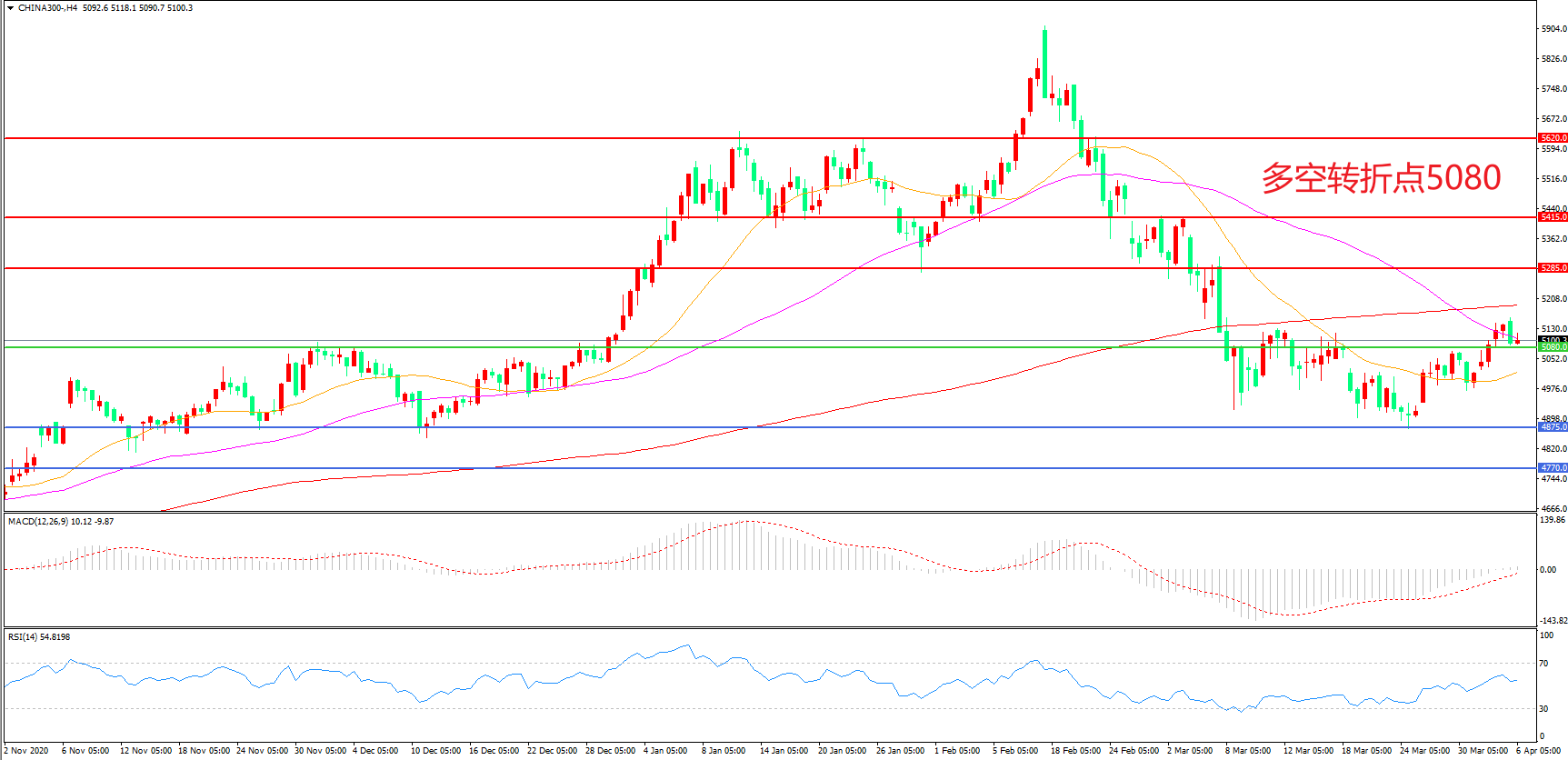 4小时图看,沪深300冲高回落,短期走势有所企稳,5080成为多空分水岭,55周期均线形成下方支撑,200周期均线成为上方阻力,MACD绿柱缩短,RSI指标向上,日内震荡上行概率较大。