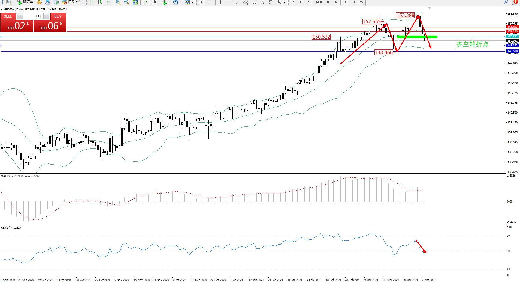 技术点评:多头动力延续布林带指标通道持续震荡上扬,高位抵达153.388位置节点遇阻回撤,急速下挫至中下轨区间震荡下行中,空头动力日渐强劲,跌势未见止步迹象,布林带指标不断拉升上扬后,高位开始有反转平移走势,MACD指标处于多头区域持续震荡向下移动中,RSI指标高位急速下挫至0轴线下方震荡;