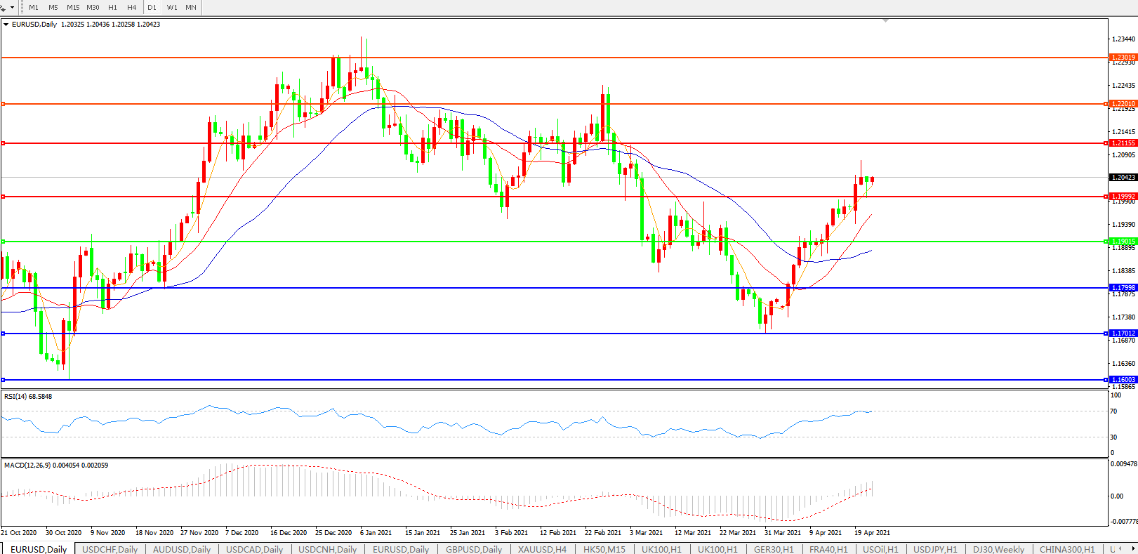 技术面简析:日图均线呈多头头排列,汇价上行遭遇压力回踩整理,MACD上穿0轴且量能有小幅放量迹象,RSI持续走升,预计短期汇价大概率在整理后进一步上行。