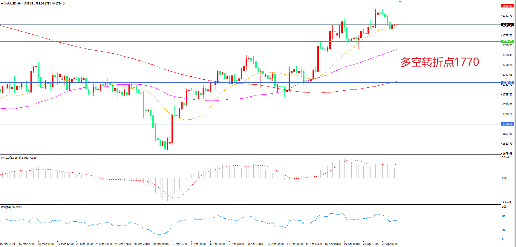 周四(4月22日),美国当周初请失业金人数超预期减少,创13个月新低。靓丽的数据提振了美元表现,美元指数回暖施压金价,现货黄金跌逾20美金后收报1784.00美元/盎司。目前美联储已进入4月下旬会议前的噤声期,在出现另一个明确的推动因素之前,金价可能会维持在1760-1810美元/盎司的新区间。
