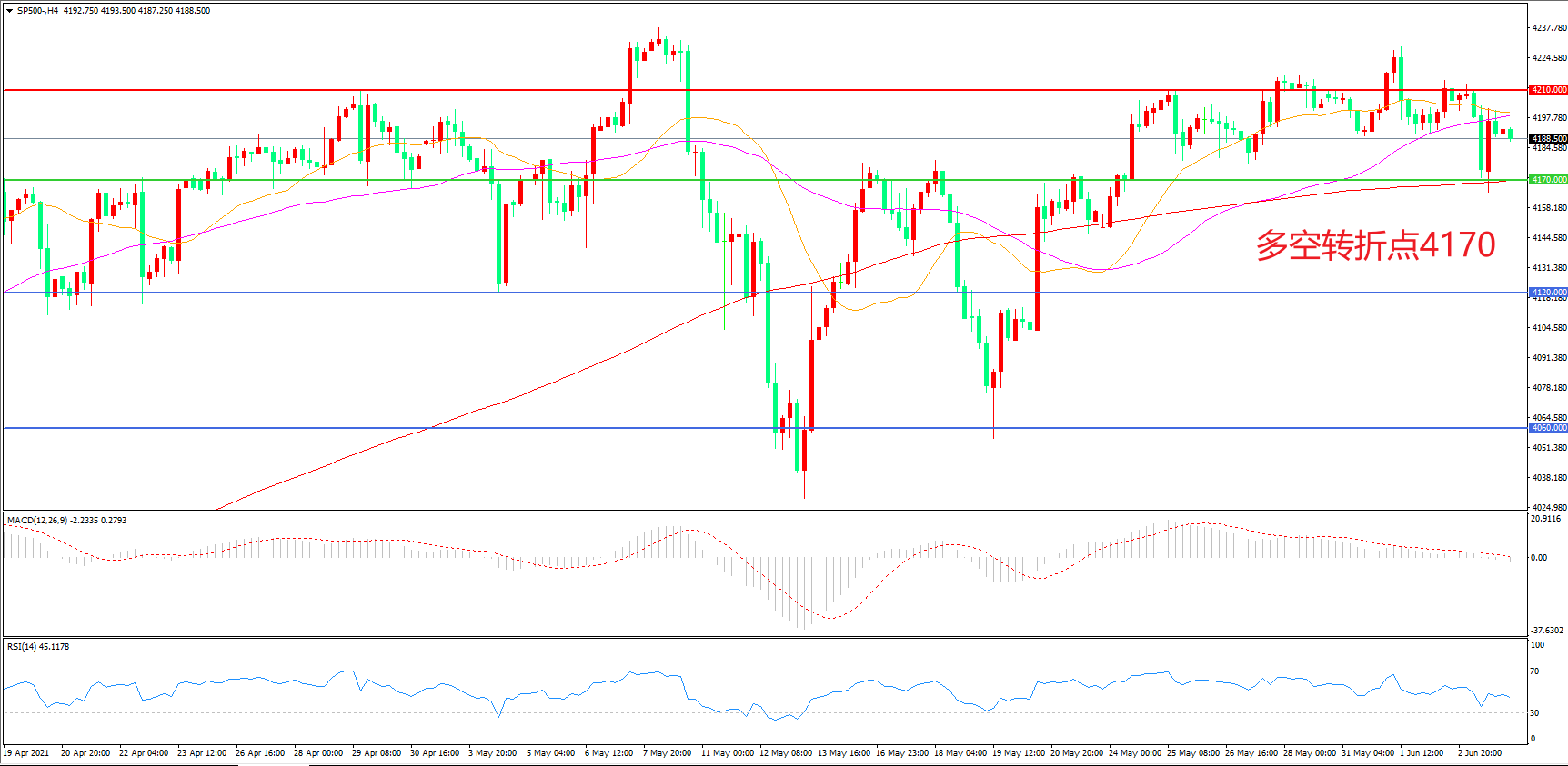 4小时图看,标普500呈现区间震荡形态,4170成为短期多空分水岭,4210成为上方阻力,200周期均线成为短期支撑,MACD红柱缩短,RSI指标走平,日内震荡上行概率较大。