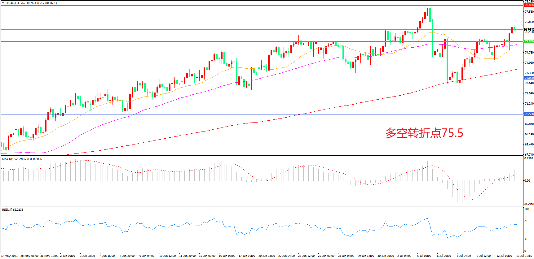 周二(7月13日),国际能源署公布的月报显示,除非欧佩克+增加供应,否则原油市场依然处于供应偏紧的状态,多头信心受到提振,布伦特原油震荡上行,收报76.33美元/桶。周三(7月14日)凌晨,根据美国石油协会公布的数据显示,当周API库存减少407.9万桶,基本符合预期,晚间市场将再次面临EIA数据的“洗礼”,若晚间EIA数据表现优于API,油价有望再次冲高。