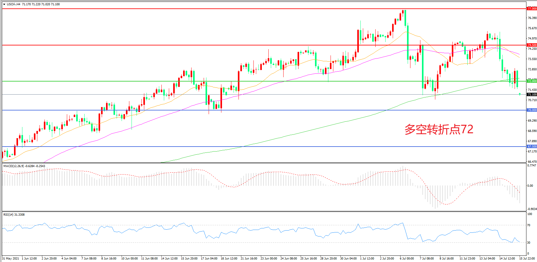 4小时图看,油价长阴下破,前期涨幅被吞噬殆尽,72美元成为短期多空分水岭,均线系统粘合形成上方阻力,MACD绿柱增加,RSI指标走平,日内震荡下行概率较大。