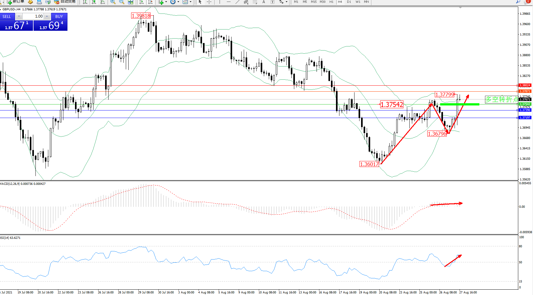 交易策略:1.37542上方看涨,目标1.37871、1.38024