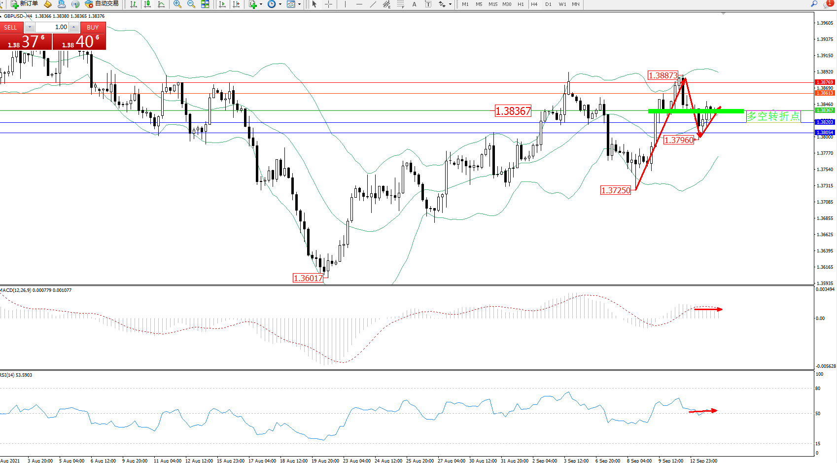 交易策略:1.38367上方看涨,目标1.38613、1.38769