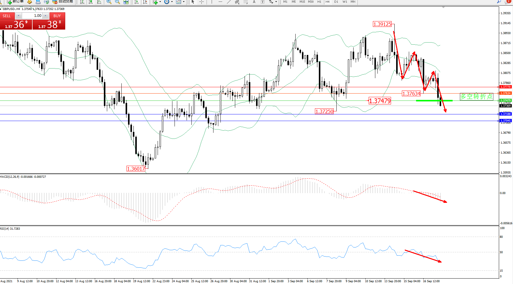 交易策略:1.37479下方看跌,目标1.37188、1.37045