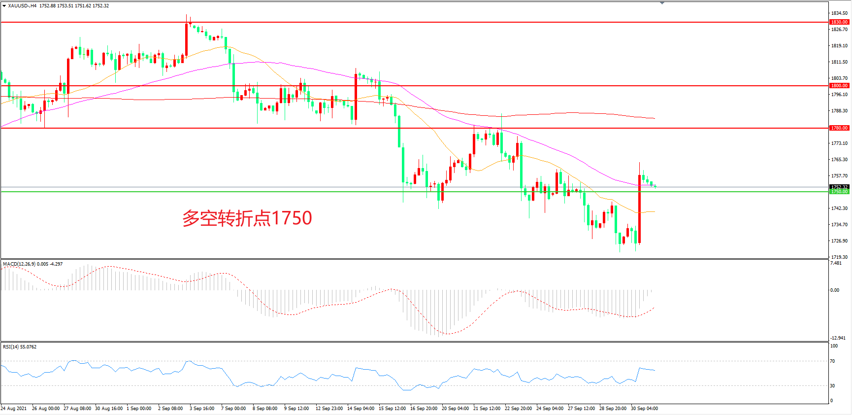 4小时图看,金价长阳拉升,短线走势有所回暖,但整体依处于下行趋势之中,1750成为多空分水岭,MACD绿柱增加,RSI指标走平,日内震荡下行概率较大。