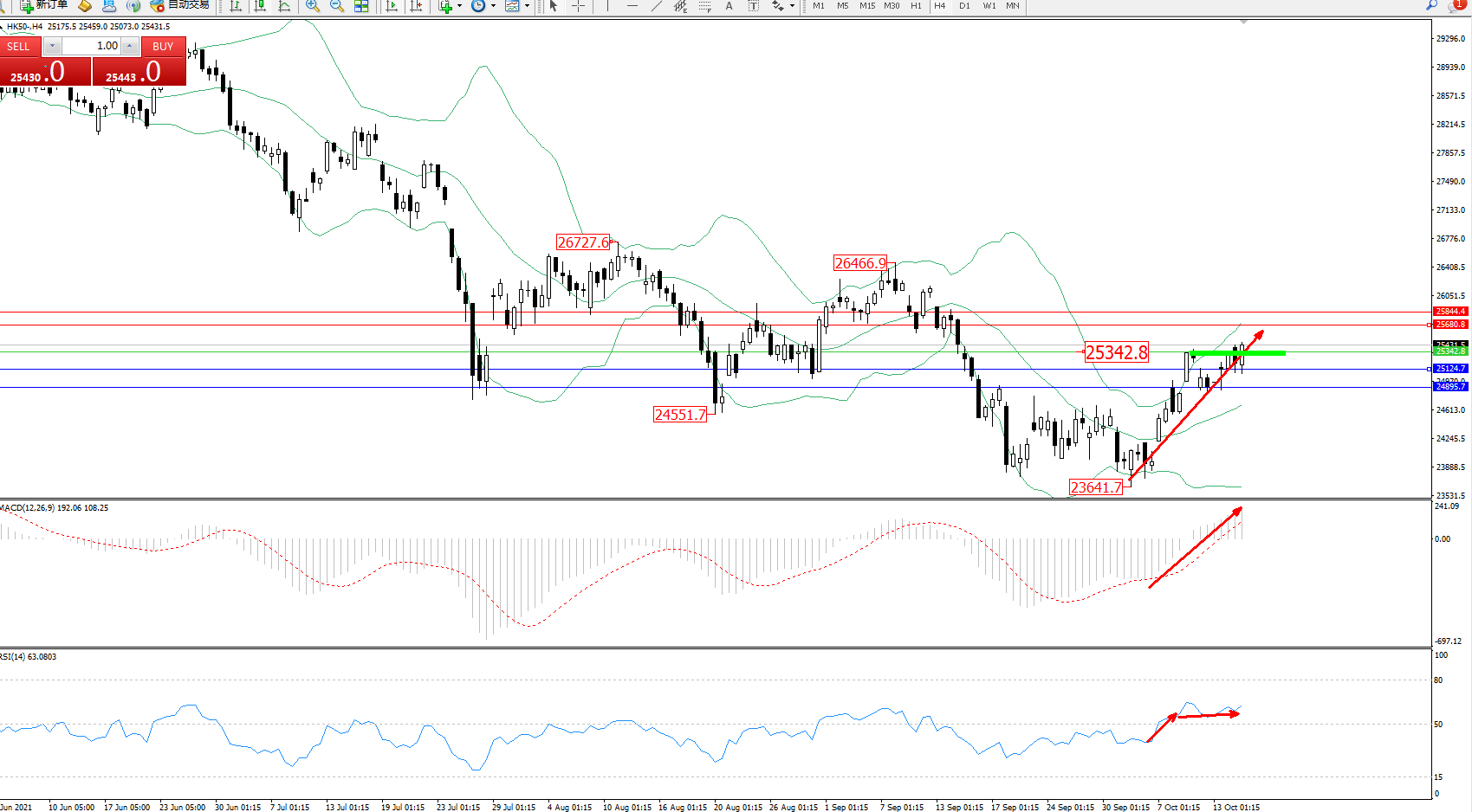 香港恒生指数10月18日(周一)收盘上涨78.79点,涨幅0.31%,报25409.75点;港股尾盘拉升,三大指数均收复盘中跌幅。恒生科技指数涨0.08%报6324点。大型科技股尾盘异动拉升,百度直线上扬超4%,腾讯、京东、阿里巴巴、小米均转涨;电力板块全天表现弱势,大金融股萎靡,电信股、家电股、啤酒股普跌。今日大市成交额为1269亿港元,南下资金净流入14.37亿港元。