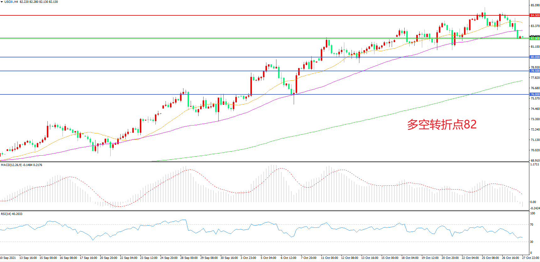 周三(10月27日),根据美国能源信息署公布的数据显示,当周美国EIA原油库存增幅超预期,精炼油库存和汽油库存降幅不及预期,库存上升导致投资者获利回吐,美国WTI原油震荡下行,收报82.15美元/桶。目前对产量限制的看涨情绪和对已处于高位的油价的担忧相互交织,油价在震荡中寻找新的方向。